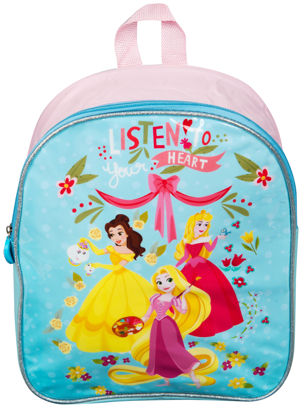Dětský baťůžek Princezny. Batoh má praktické ucho na nošení v ruce a nastavitelné a polstrované popruhy a je na zip. Rozměr baťůžku 32×26×10 cm.