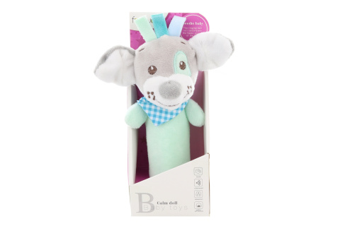 Chrastítko plyšové zelené s hlavou pejska o rozměrech cca16,5 x 12 x 6,5 cm. Rozměr balení cca 7 x 17 x 6,5 cm. Věk 0+