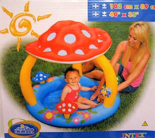- slunečník ve tvaru houby, 102cm x 89 cm, měkké nafukovací dno pro příjemné hraní, pevný testovací vinyl, záplata na opravu