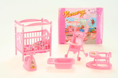 Glorie Dětský pokojík obsahuje plastovou postýlku o rozměrechcca 13,5 cm X 9 cm X 15 cm s peřinkou a polštářkem pro miminko,plastový kočárek o výšce cca 16 cm,chodítko cca 9 cm X 11 cm,nočník o cca 7 cm X 6 cm a vaničku cca 7 cm X 10,5 cm X 02 cm.Věk 3+