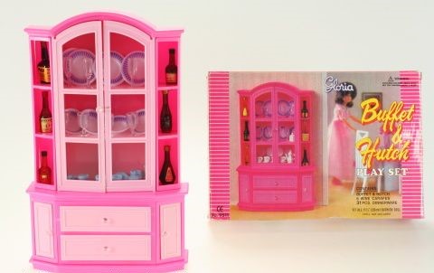 Glorie skříň má 2 šuplíky a 2 skříňky s otevíracími dvířkami. Prosklený prostor obsahuje 8 talířů, 8 skleniček, 6 lahví a čajový servis. Rozměry skříně 19 x 28 cm. Panenka není součástí. Věk 3+.