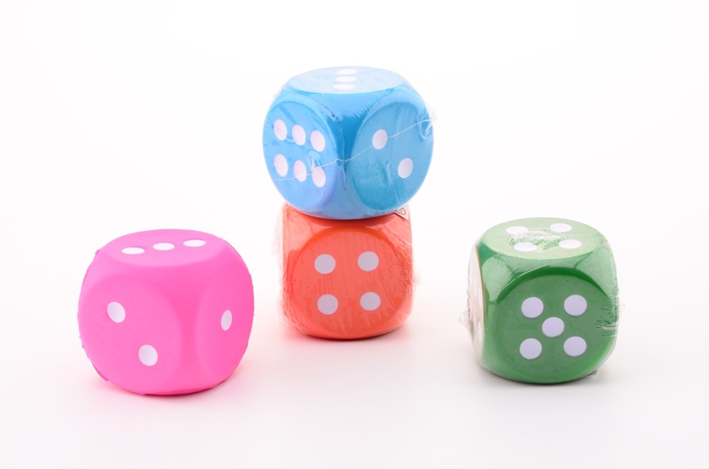 Hrací kostky pěnové střední, ve čtyřech barvách – růžová, světle modrá, oranžová a zelená. Velikost kostky 7,5×7,5×7,5 cm.