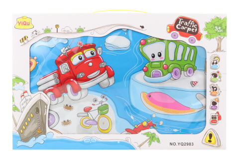 Hrací koberec s dopravními prostředky. Rozměry koberce cca 40 x 59,5 cm. Napájení 3 AA baterie (nejsou součástí). Koberec vydává zvuky jako dopravní prostředky. Rozměry balení cca 41 x 26 x 4 cm. Věk 3+