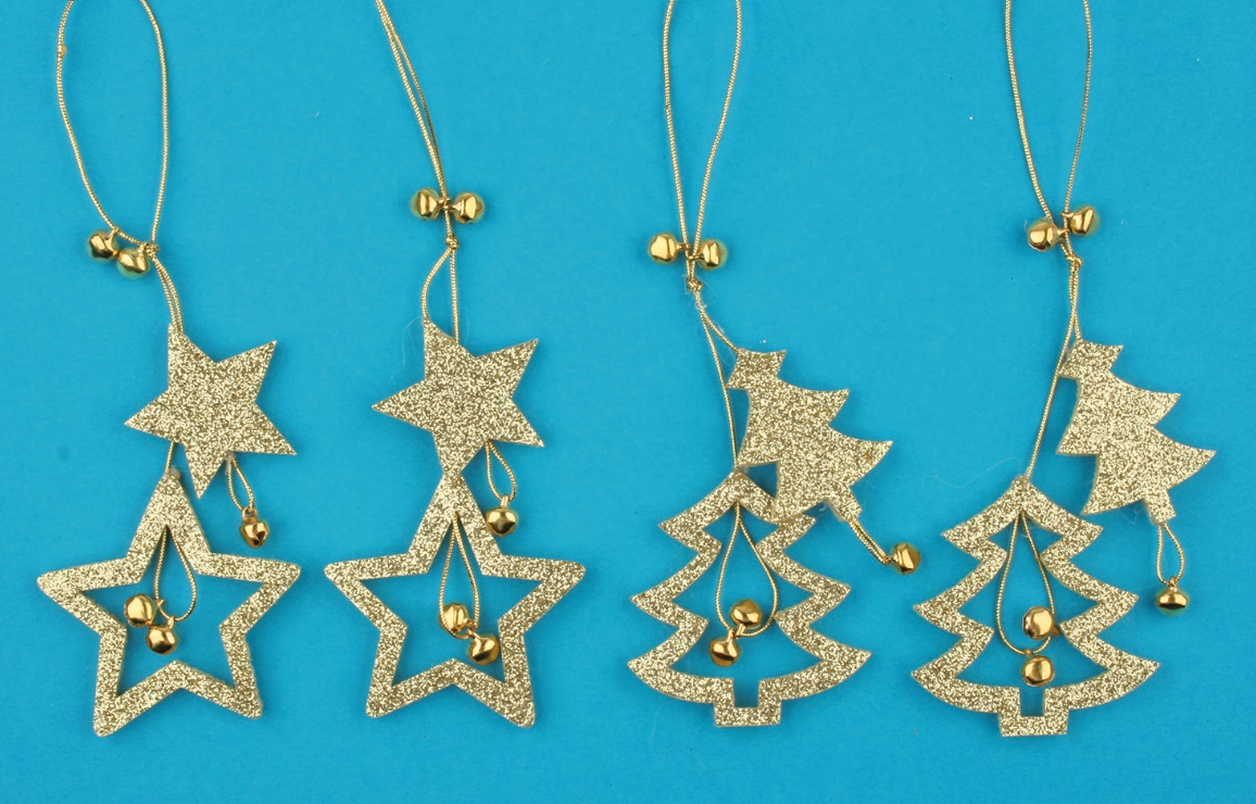 - Hvězda a strom s glitry na zavěšení 13cm, 4 ks,zlatá
