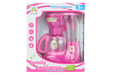 Plastový kávovar na baterie. Napájení na 3 AA baterie (nejsou součástí). Kávovar vydává zvuky a svítí stejně jako při přípravě kávy. Kávovar o velikosti 15 x 13 cm. Rozměry balení cca 17 x 21 x 9,5 cm. Věk 3+