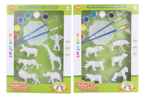 Sada malovacích zvířátek. Balení obsahuje plastové figurky zvířátek k vybarvení. Balení dále obsahuje 6 barev, 2 štětečky a paletku. Rozměr zvířátka cca 7 cm (dle druhu). Rozměry balení cca 21 x 29 x 3,5 cm. Věk 3+