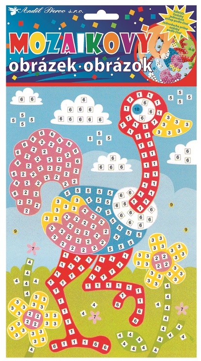 Balení obsahuje předtištěný obrázek 23x16cm, pěnové samolepky různých barev, třpytivé kamínky a stojánek na obrázek.