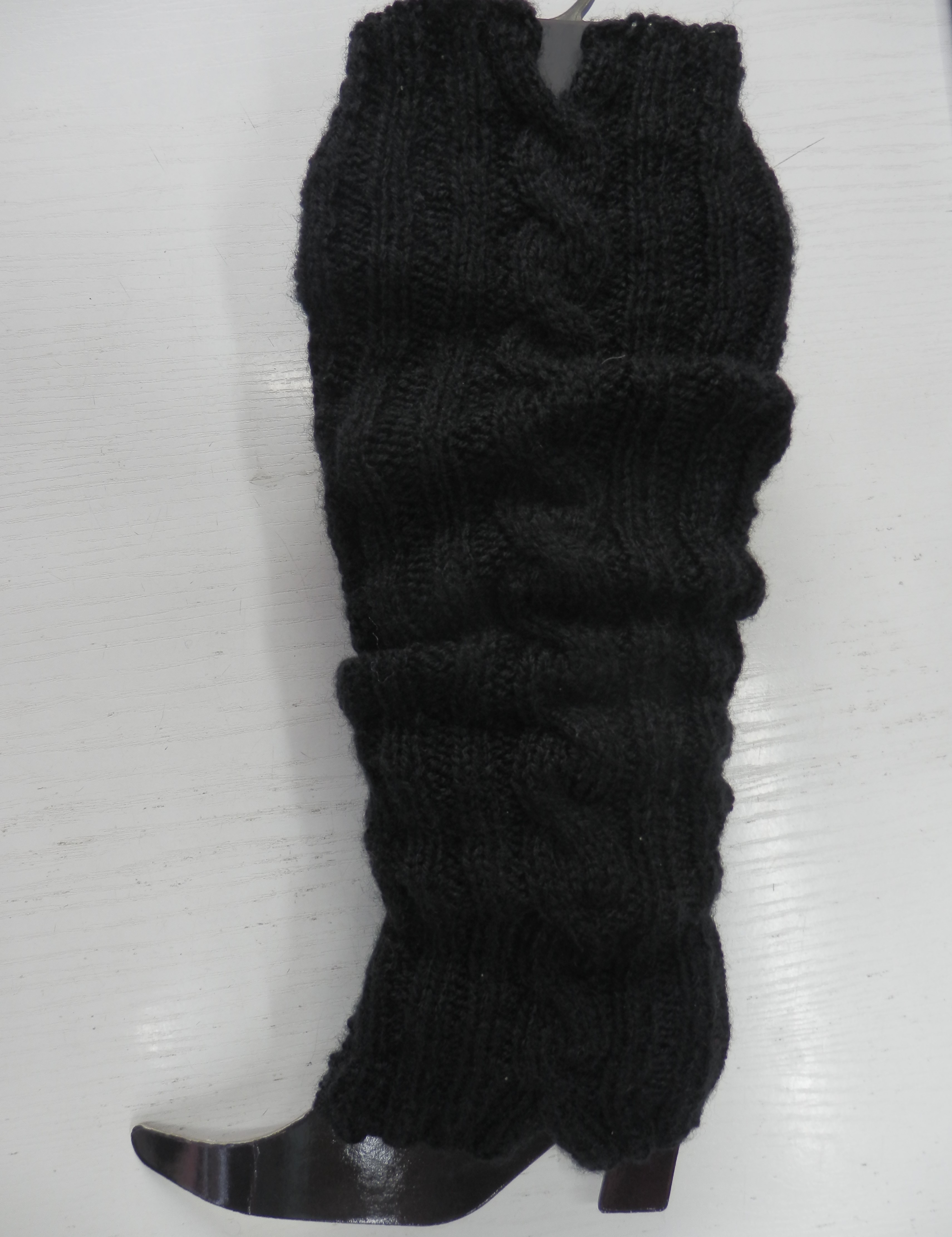 Ručně pletené návleky na nohy s copánkovým vzorem s malými rozparky na obou okrajích.