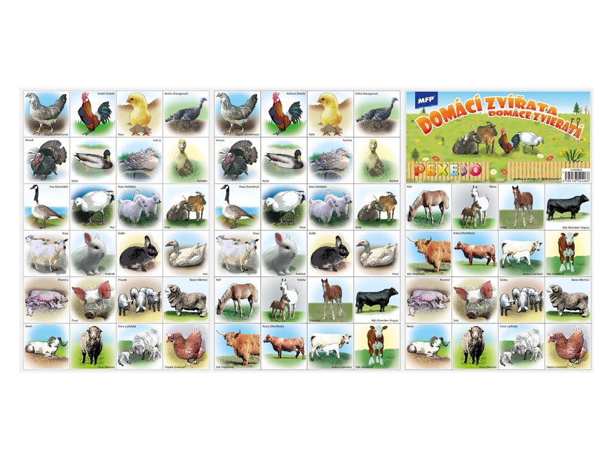 Pexeso se skládá ze tří A4, na kterých najdete 64 kartiček domácích zvířat a návod ke hře - na kartičkách jsou názvy zvířat
