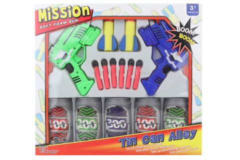 Tu správnou zábavu zažiješ s touto sadou dvou pistolek na pěnové šipky a sadou pěti plechovek.Kdo bude lepší a sestřelí plechovky s více body? Rozměr balení 37 x 34 x 7 cm.Věk 3+