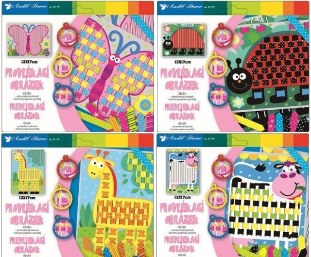 Balení obsahuje: 1x předlohu k provlékání a 22 papírových pásků různých barev