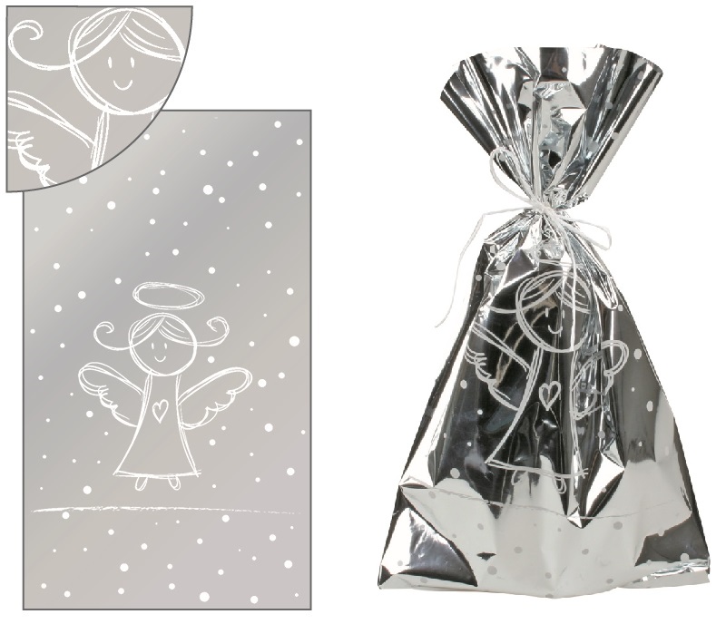 Sáček stříbrný s bílým andílkem 20x35cm 13504Skladem5 Kč/ ks4 Kč bez DPH