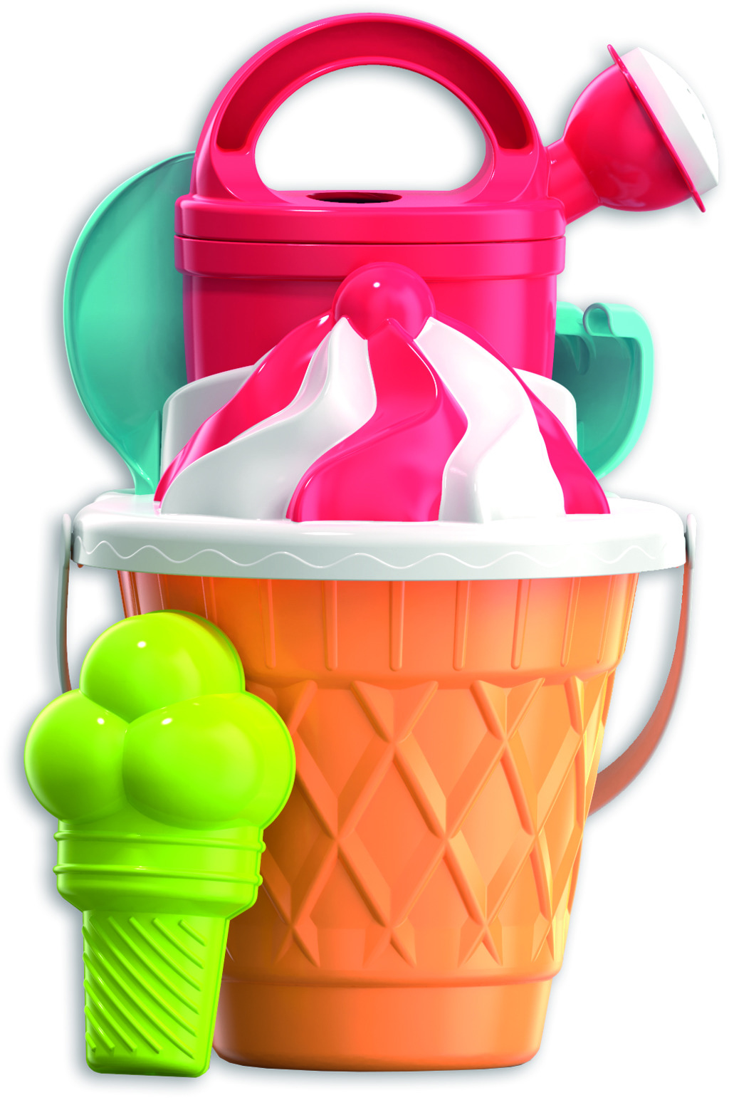 Sada na písek cukrárna. Sada obsahuje kyblík ve tvaru kornoutu (17×30 cm), lopatku hrabičky, konvičku, bábovku ve tvaru zrzliny a polevy a sítko.