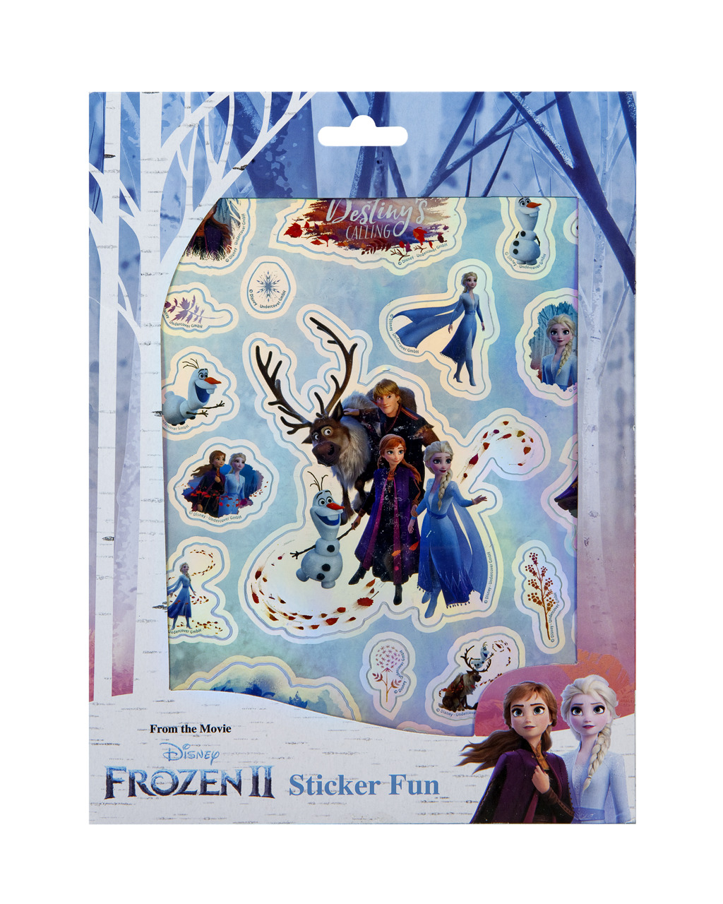 Samolepky Ledové království – aršík s metalickými samolepkami a 7 aršíků se normálními samolepkami (16,60 × 22,30 cm).