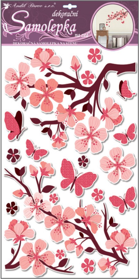 - Samolepky na zeď s glitrem, 50x32 cm, růžová větev