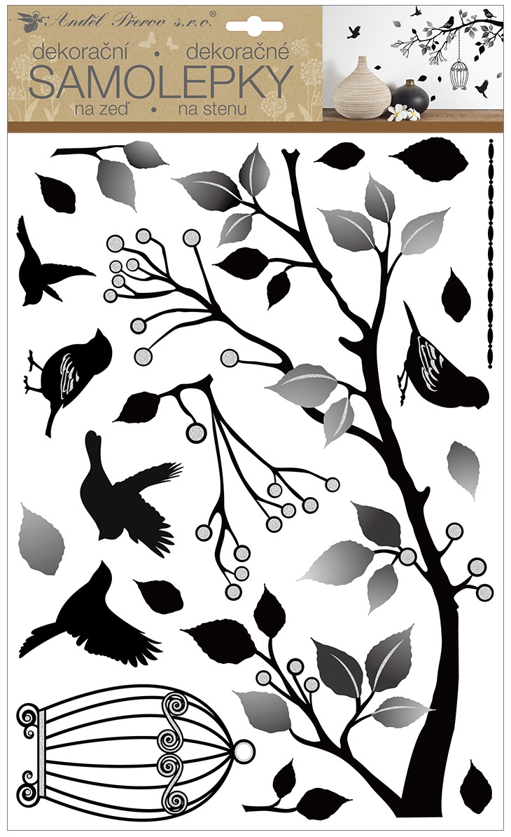 - Samolepky na zeď větev s klecí se stříbrnými glitry 29 x 48 cm