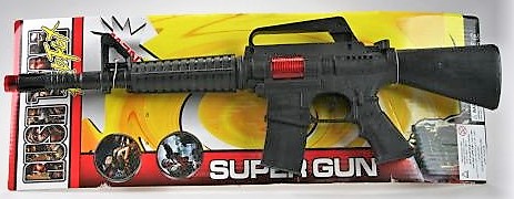 Platový samopal o velikosti cca 43 cm ,při zmáčkutí rachtá,jiskří.Věk 3+