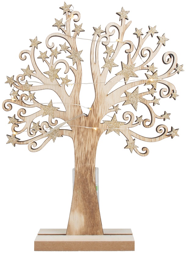 Strom dřevěný se zlatými hvězdami 22 x 30 cm, s LED světýlky