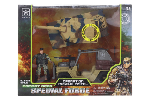 Plastová vojenská sada obsahuje terénní auto, tank (jezdí a vydává zvuky - napájení na 3 AG13 baterie, které jsou součástí balení) a vojáčka. Rozměry balení cca 32 x 25,5 x 10,5 cm. Věk 3+