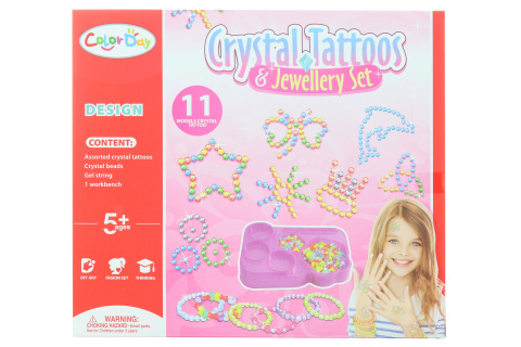 Sada na výrobu náramků z korálků a tetování. Balení obsahuje 11 druhů tetování, sáček korálků, provázek a praktický organizér. Rozměry balení cca 29 x 25,5 x 6,5 cm. Věk 5+