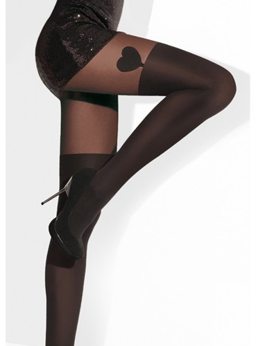 Dámské vzorované punčochové kalhoty s obsahem mikrofibry a lycry. Vzorované punčocháče imitují dámské samodržící punčochy a jsou ozdobené vzorem srdíčka. Punčochové kalhoty jsou šité plochým švem, bez zesíleného sedu.