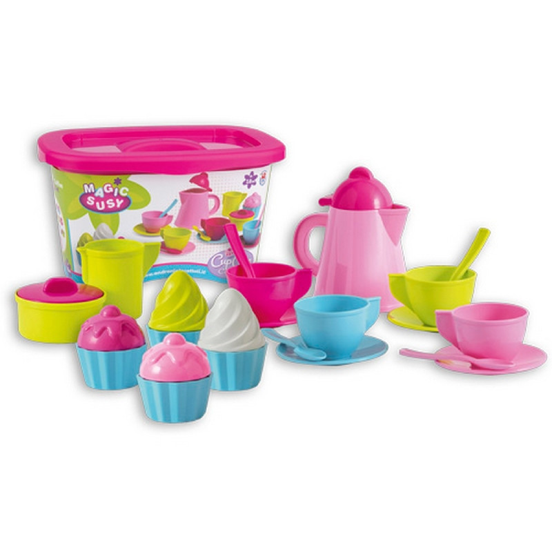 Obsahuje: Konvici, 4 hrnečky s podšálky na kávu nebo čaj, 4 kávové lžičky, cukřenku s víčkem, konvičku na mléko, 4 x cupcake a úložný box s víkem.