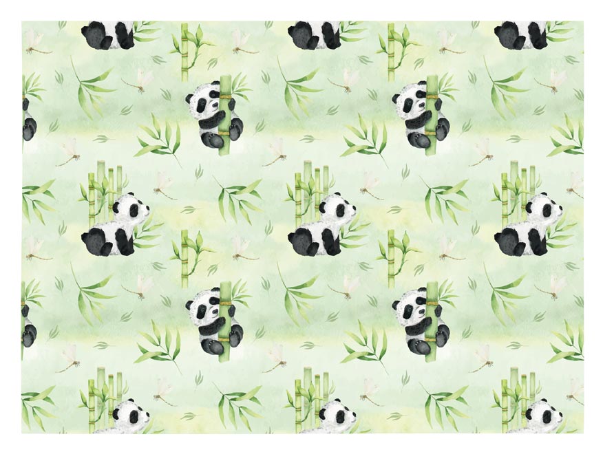 Na světle zeleném pozadí se líně procházejí pandy, mezi bambusovými stvoly poletují vážky, a vše dýchá klidem jako tichá zahrada v japonském parku.