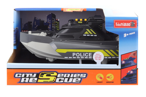 Policejní člun. Napájení na 3 AG13 baterie(jsou součástí balení). Materiál plast. Po vložení baterií člun svítí a vydává zvukové efekty. Baleno v krabičce. Rozměry balení cca 24x13,5x11,5 cm. Velikost člunu cca 21 cm. Věk 3+