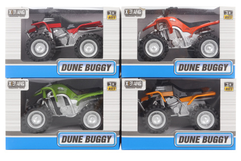Kovová čtyřkolka o velikosti cca 10,5 x 6,5 x 8 cm. Rozměry balení cca 14,5 x 9 x 9 cm. Věk 3+