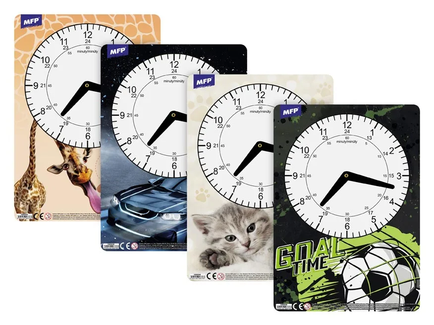 Dětské papírové hodiny s různými motivy. Didaktická pomůcka, dobře využitelná k výuce času u dětí předškolního věku nebo u prvňáčků. Tyto cvičné hodiny nesmí chybět Vašemu dítěti při nástupu do první třídy základní školy.