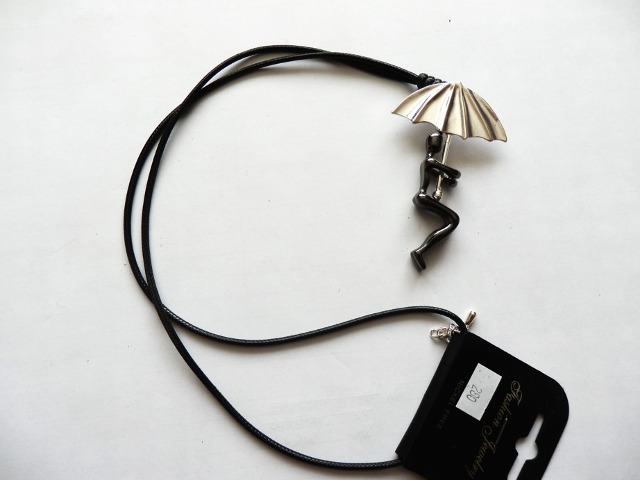 Výrazný přívěsek POSTAVY (v barve grafit) S DEŠTNÍKEM (ve stříbrné barvě) na dlouhé voskované šňůrce v černé barvě. Zapínání na karabinku s prodlužovacím řetízkem.
