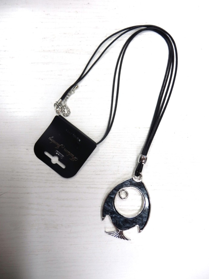 Výrazný přívěsek RYBA ve stříbrné barvě s černým mramorovým detailem na dlouhé dvojité voskované šňůrce v černé barvě. Zapínání na karabinku s prodlužovacím řetízkem.