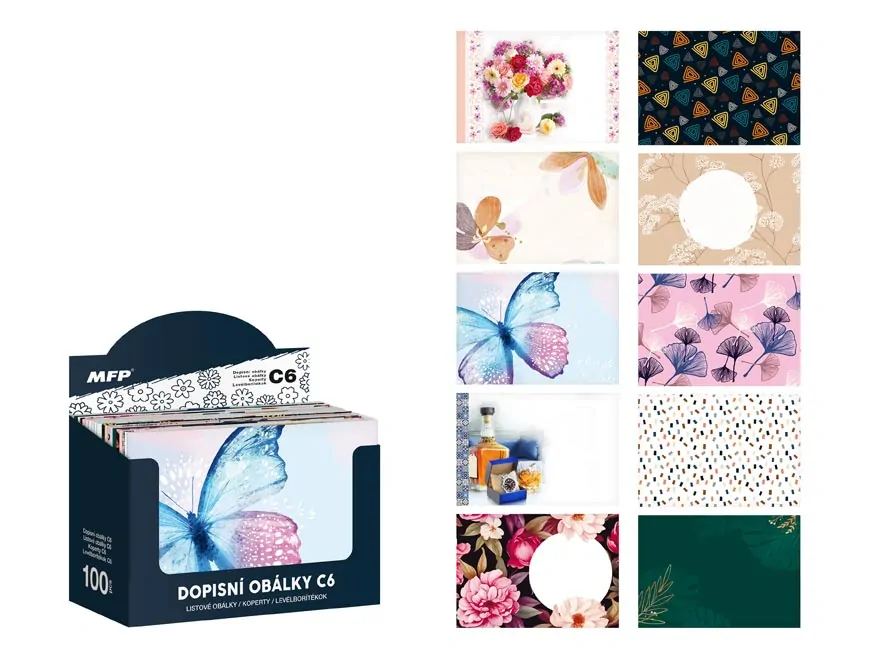 Celoplošně potištěné, dopisní obálky C6 s krycí páskou. Posíláte rádi dopisy? Pořiďte si u nás dopisní obálky a nezapomeňte si u nás také koupit dopisní papír a propisku!