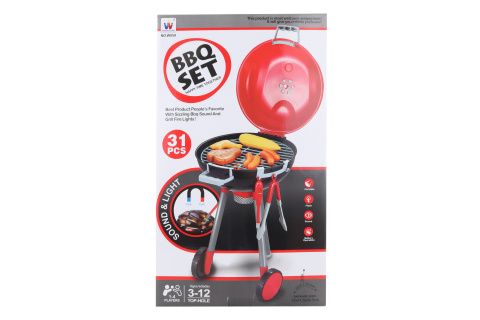Plastový gril velký s doplňky a jídlem na grilování. Po zapnutí uhlíků v grilu začnou vydávát zvuk a svítit. Napájení na 3AAA baterie (nejsou součástí). Rozměry cca 33 x 14,5 x 56,5 cm. Věk 3+