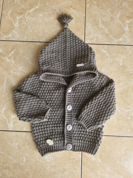ručně háčkovaný svetřík v šedé barvě pro děti asi 2 - 3 roky, s kapucí s třapečkem, zapínání na knoflíky