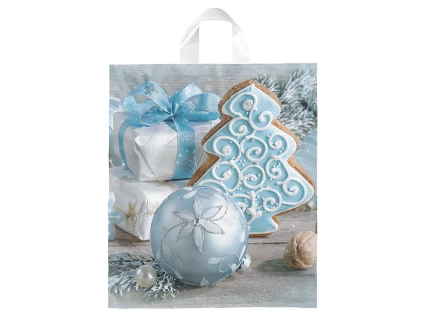 Igelitová nákupní taška s jemným zimním motivem v modrobílých tónech přináší nádech sváteční elegance. Výrazný perníček ve tvaru stromečku, dárky s mašlemi a vánoční ozdoba vytvářejí harmonickou atmosféru klidu a radosti. Taška je vyrobena z pevného igelitu, má praktická ucha, takže se hodí nejen na každodenní nákupy, ale i na balení dárků či přenášení větších předmětů během vánoční sezóny.