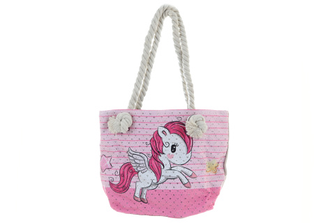 Látková kabelka přes rameno jednorožec. Kabelka má 1 přihrádku na zip. Přední strana s obrázkem pogumovaná (omyvatelná). Rozměry kabelky 28x20 cm. Délka uch 23cm x2. Výrobek není hračka. Baleno v sáčku.