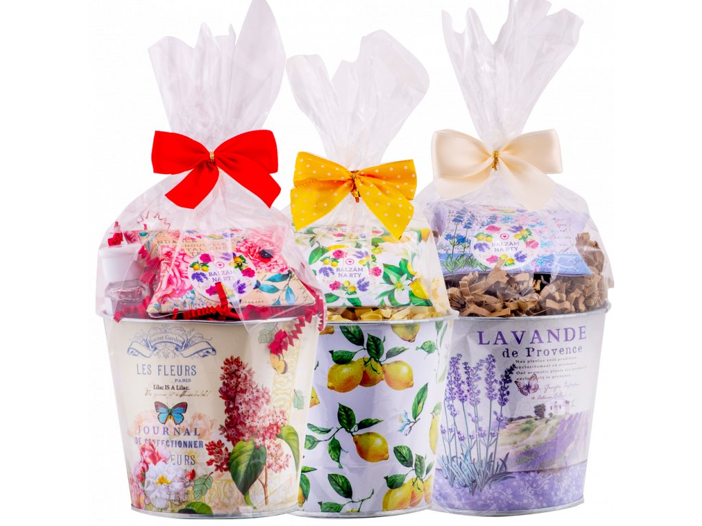 Krásný plechový květník s designem květin. Obsahuje dárkový hydratační balzám na rty a čistící gel na ruce. ´- varianta levandule