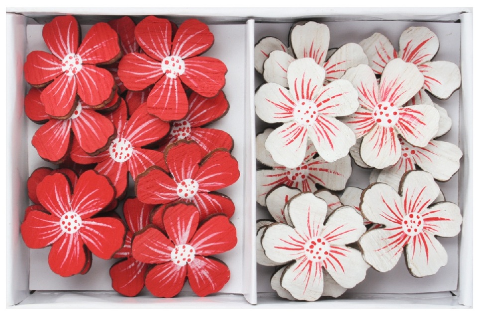 - Kytky dřevěné červené a bílé 2,5 x 2,5 x 0,3 cm s lepíkem, 24 ks v krabičce 7123