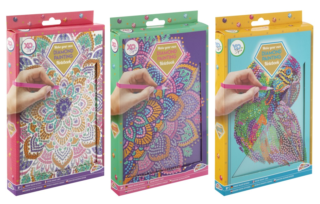 Malování pomocí kamínků Diamond – diář A5 – pomocí kamínků si vytvoř svůj vlastní design diáře – tři různé druhy – dva různé typy mandal a papoušek. Balení obsahuje diář A5, třídič na kamínky, aplikátor, 11 barev kamínků a lepidlo