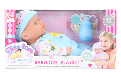Miminko s doplňky. - Miminko má hadrové tělo,Panenka po vložení baterií vydává zvuky - 10 různých zvuků .Balení obsahuje také lahvičku. Napájení na 3 AG13 baterie (jsou součástí balení). Rozměry miminka 30 x 12 cm. Rozměry balení cca 30 x 16 x 12,5 cm. Věk 3+