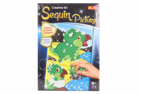 Sada obsahuje předlohu s motivem dinosaurů, sadu flitrových doplňků a hřebíčku pro snadnou aplikaci a ilustrovaný návod krok za krokem. Děti podle návodu nebo fantazie aplikují pomocí hřebíčku flitry na obrázek. Rozměr balení cca 24 x 33,5 x 5 cm. Věk 6+