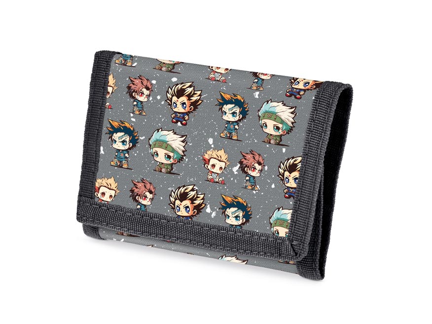 Dětská textilní peněženka v tmavě šedé barvě s motivem anime maskotů a zapínáním na suchý zip. Peněženka má přihrádku na bankovky, mince, kapsičku vhodnou například na jízdenky a také kapsičku s průhledným okýnkem o velikosti kreditní karty.