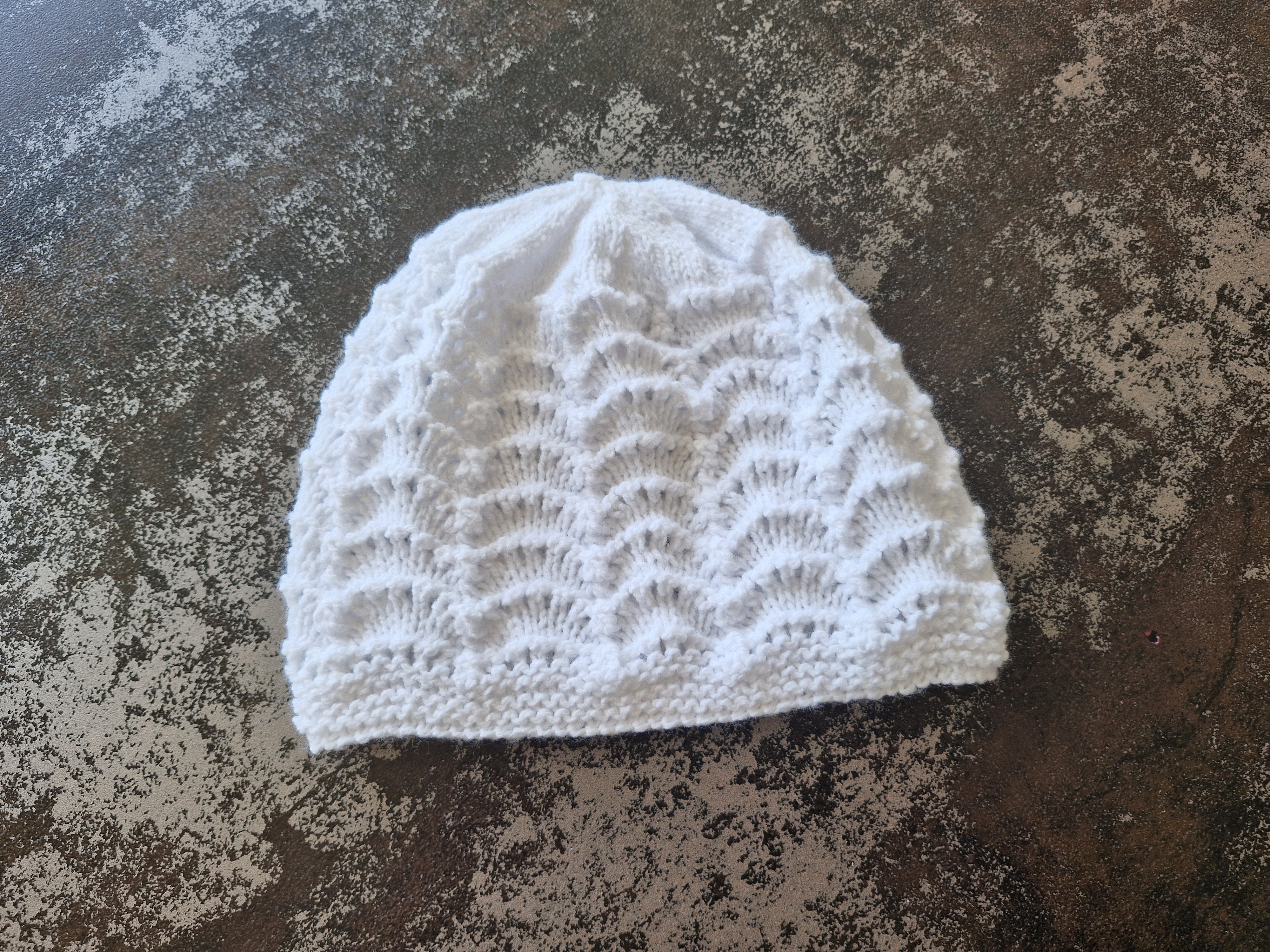 ručně pletená čepička pro malou slečnu v bílé barvě se vzorem.