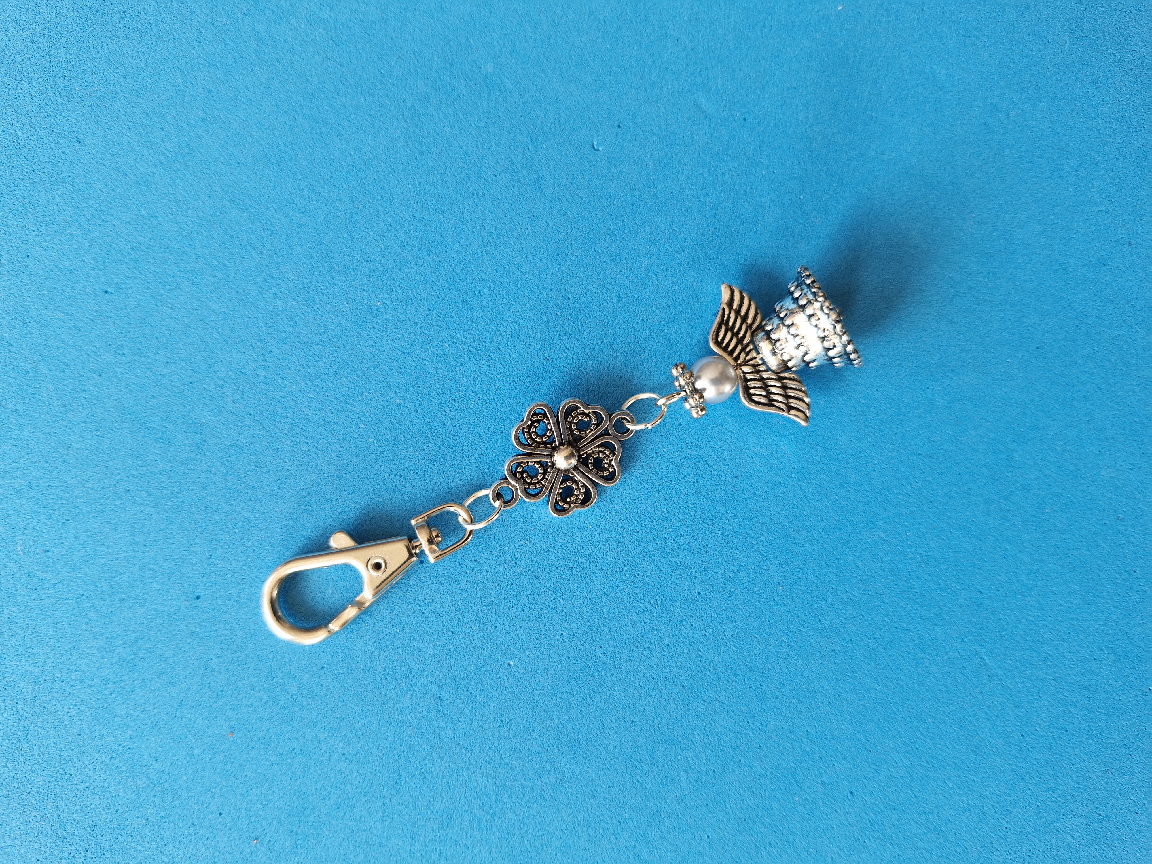 Rozměry: výška andělíčka 2 cm, karabinka 26 x 10 mm, celková délka přívěsku 8 cm