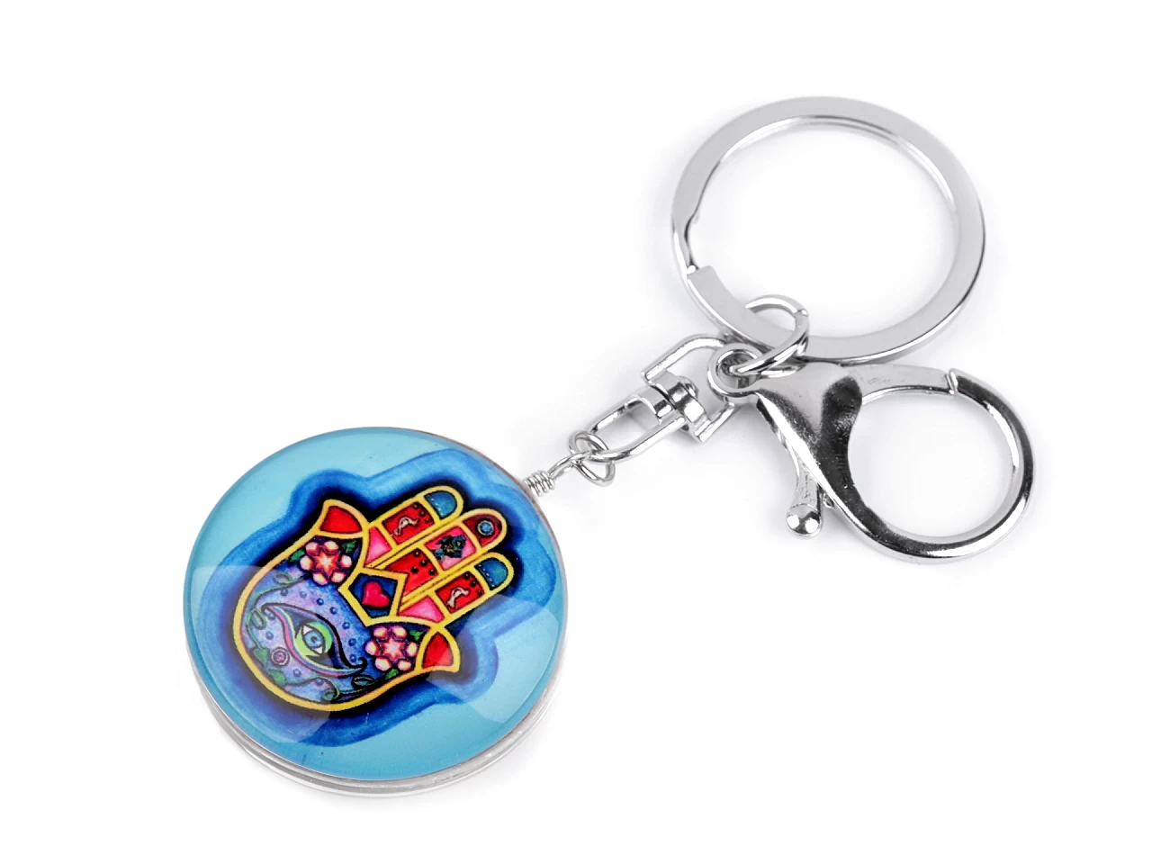 Barevný přívěsek s barevným obrázkem Hamsy, ruky Fatimy, je velice poutavý, přímo až magický. Z obou stran má vypouklé čočky, které obrázku dodávají efektní hloubku. Díky otočné karabince nebo rozevíracího kroužku jej můžete připevnit na tašku, batoh, kabelku nebo klíče.