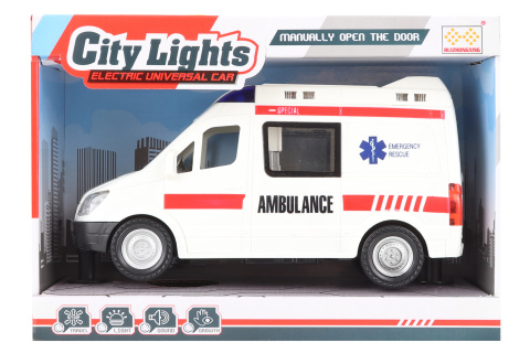 Plastová sanitka o rozměru cca 22 x 12 x 9 cm na baterie. Sanitka vydává zvuky a svítí.Jezdí a při nárazu mění směr. Napájení 3x AA baterie . nejsou součástí. Rozměr balení cca 26,5 x 18,5 x 11 cm. Věk 3+