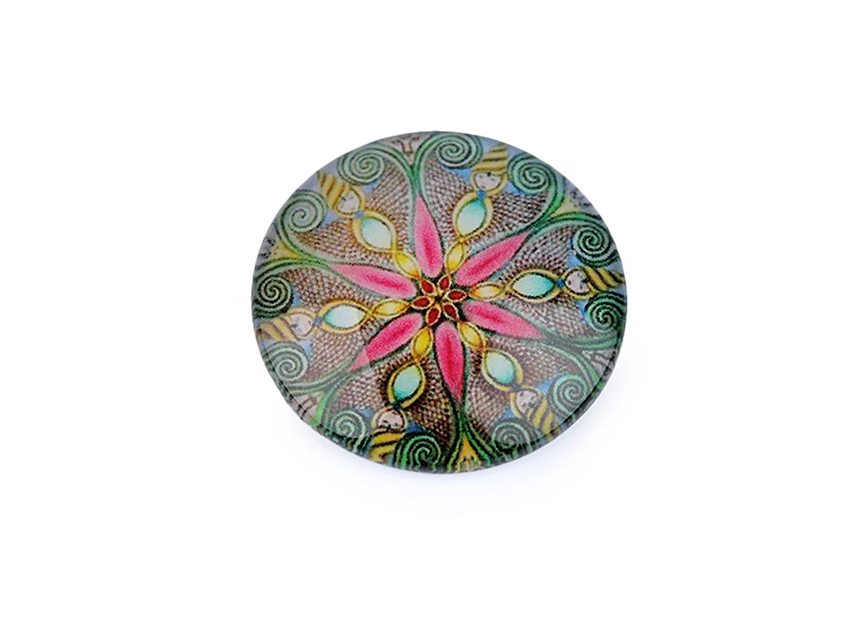 Kulatý skleněný kabošon s motivem mandaly má precizní propracování. Díky tvaru vypouklé čočky obrázek krásně vynikne. Kabošony jsou vhodné k nalepení do kovového lůžka nebo k obšití korálky a rokajlem. Velice působivé jsou v drátovaných špercích. Pro přilepení kabošonu je vhodné použít lepidlo na lepení kamínků.