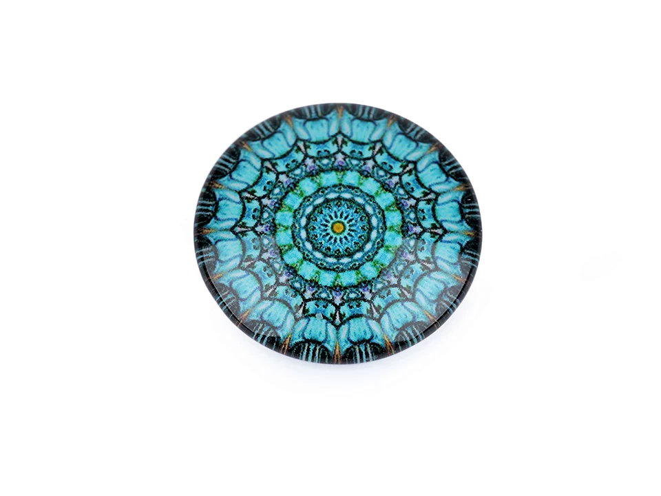 Kulatý skleněný kabošon s motivem mandaly má precizní propracování. Díky tvaru vypouklé čočky obrázek krásně vynikne. Kabošony jsou vhodné k nalepení do kovového lůžka nebo k obšití korálky a rokajlem. Velice působivé jsou v drátovaných špercích. Pro přilepení kabošonu je vhodné použít lepidlo na lepení kamínků.