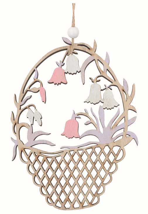Delikátně vyřezávaný dřevěný košík ozdobený motivem fialových květů je elegantní dekorace, která vnese do vašeho domova jemný jarní akcent. Subtilní květinový vzor se skvěle hodí pro jarní, velikonoční i celoroční výzdobu. Dekoraci lze zavěsit na okno, dveře, větvičku nebo ji využít jako součást sezónních aranžmá. Díky očku a šňůrce je zavěšení snadné a praktické.